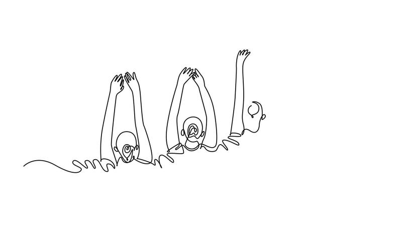 Animated self drawing of continuous line draw four women are performing synchronized sculling drill in water, with their arms raised above surface. Grace, precision. Full length single line animation Pro Video