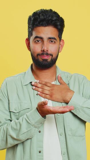 Need some more, please give me. Indian man showing a little bit gesture with sceptic smile showing minimum sign, measuring small size, begging help. Arabian guy isolated on yellow studio background Pro Video