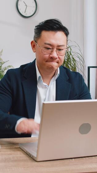 Irritated tired Asian business man while working on laptop, unexpected online website problem, computer virus data loss by hacking. Freelancer feeling mad about broken notebook at office workplace Pro Video