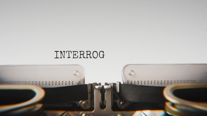 Old mechanical typewriter typing Interrogation Log in a close up view, with metal letters striking the white paper. Pro Video