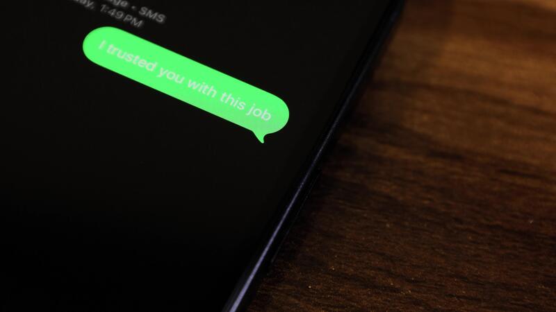 Close-up view of a smartphone screen showing an outgoing I trusted you with this job, and you completely failed, you are fired, no more chances text message in a green bubble, captured as it sends. Pro Video