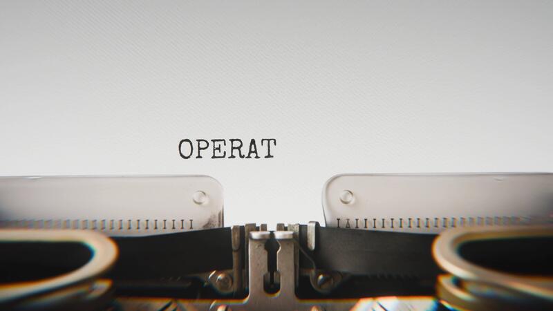 Old mechanical typewriter typing Operations Improved in a close up view, with metal letters striking the white paper. Pro Video