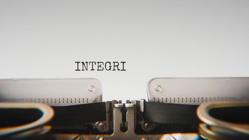 Old mechanical typewriter typing Integrity in a close up view, with metal letters striking the white paper. Pro Video