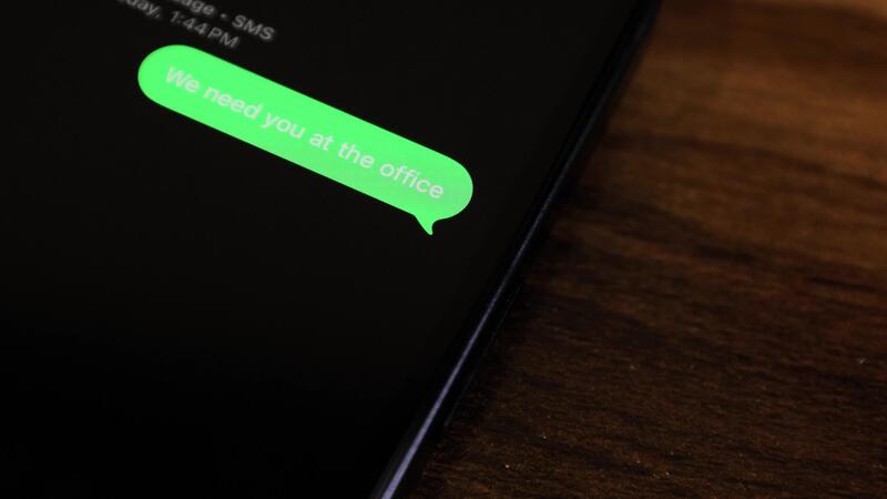 Close-up view of a smartphone screen showing an outgoing We need you at the office, there is an issue with the report, Please call back urgent. text message in a green bubble, captured as it sends. Pro Video