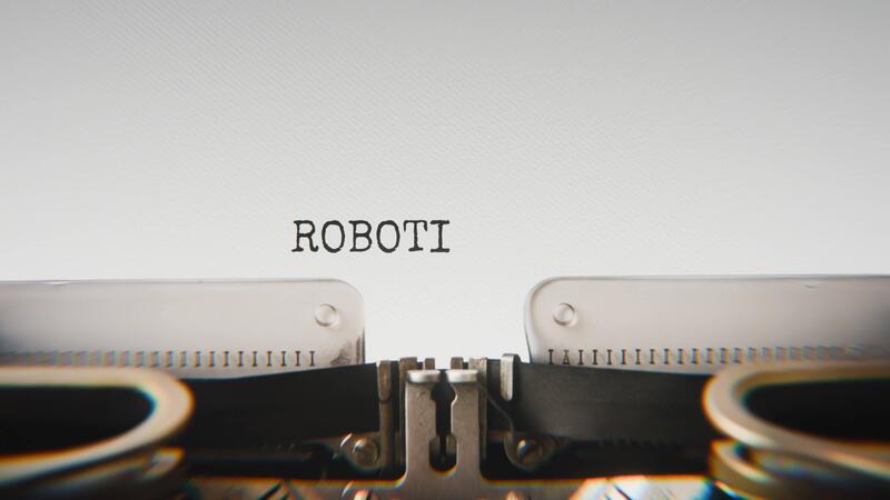 Old mechanical typewriter typing Robotics in a close up view, with metal letters striking the white paper. Pro Video