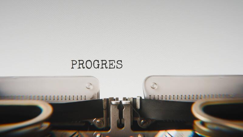 Old mechanical typewriter typing Progress Not Perfection in a close up view, with metal letters striking the white paper. Pro Video
