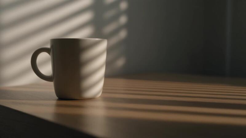 Morning light streaming through blinds casting gentle shadows over a mug on a desk creating a calm peaceful atmosphere in a warm minimalist setting Free Video