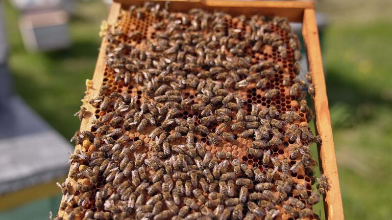 Brown honey frame covered with bees from both sides. Apiarist turns the frame in hands. Close up. Blurred backdrop. Pro Video