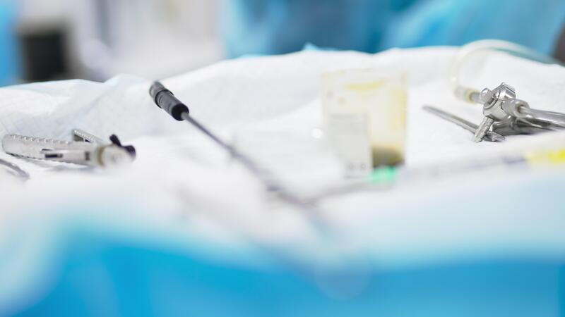 Instruments and tools prepared for surgery. Devices at the table close up. Blurred foreground transforms into blurred backdrop. Pro Video