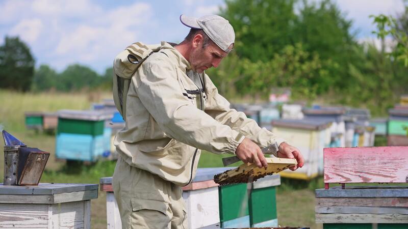 Light empty frame half-covered with bees in the hands of a male apiarist. Beekeeper shakes off the bees and puts a frame beside the hive. Apiary and nature at backdrop in blur. Pro Video