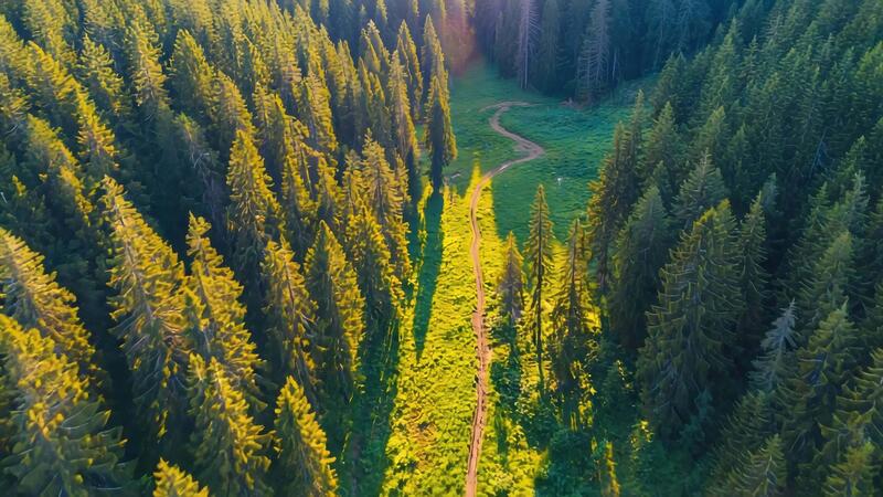 Aerial view of a dense evergreen forest with a winding path cutting through the trees on a sunny day Free Video