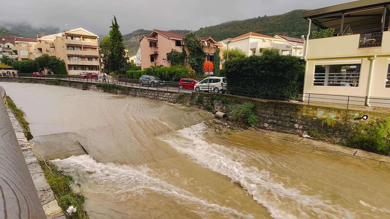 swollen muddy stream rushing past riverside buildings, white foam cascading over small drop, cloudy hills in background, turbulent flow carrying silt Pro Video