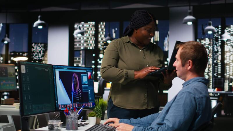 Media editing team retouching photos for new web content, creative interface for professional design industry. Using artificial intelligence to edit materials, text to image. Camera B. Pro Video