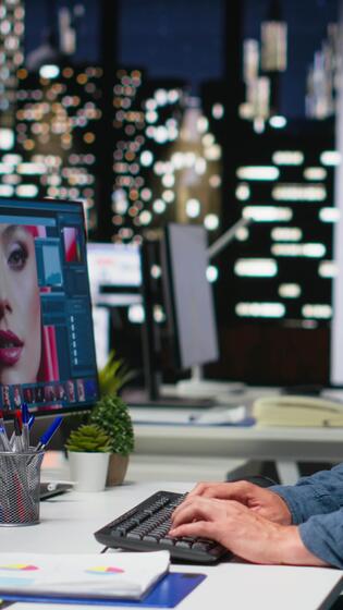 Vertical Media editor using AI program turning text prompt into photos, retouching technique. Graphic designer text to image artificial intelligence generator transforming words into pictures. Camera B. Pro Video