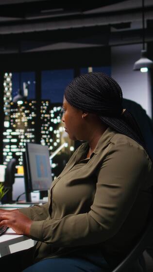Vertical Woman editor works on professional content for photography editing in modern workspace with dual monitors. Retouching software and virtual assistant for a creative career. Camera A. Pro Video