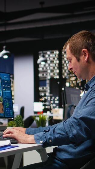 Vertical Interior designer engineer using AI neural networks to help create furniture and layout of new apartment building, architectural software for floor plan at workstation. Dual monitors. Camera A. Pro Video