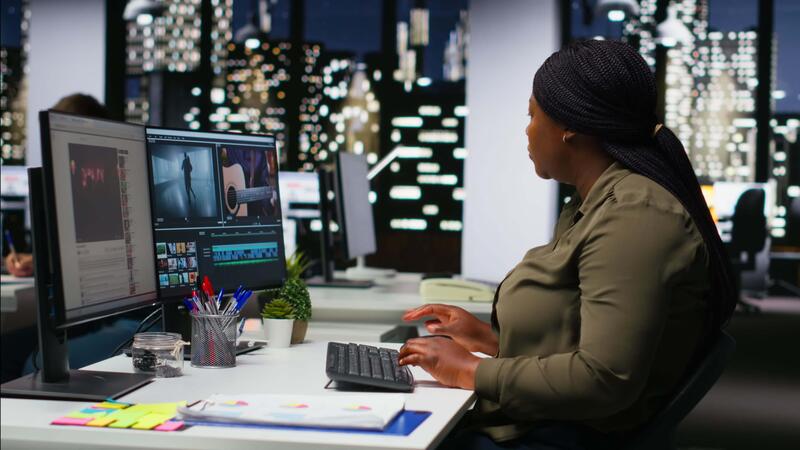 Man and woman filmmakers editing shoot in post production, using modern tech setup and editing software for a creative project. Modern workspace with dual monitors. Camera B. Pro Video