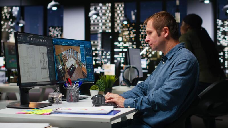 Skilled architect creating a 3D render of apartment interior layout, utilizing architectural software on dual monitors. Developer uses digital tools to decorate design, placing assets. Camera B. Pro Video