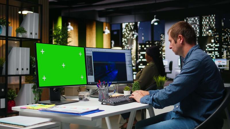 Chroma key with male employee working on game development, using dual monitors at workstation. Young expert engineer creating futuristic spaceship station on modern software. Camera A. Pro Video
