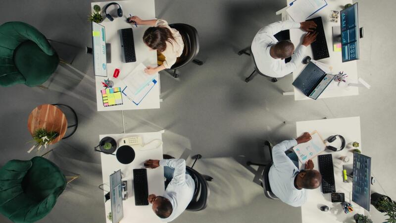 Top down view zoom in of colleagues sharing reports and visual data on computer. Work team performs risk assessment, strategy planning to ensure strong performance and progress. Camera A. Pro Video
