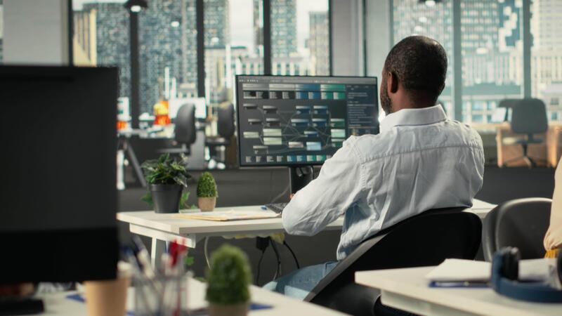 Professional workers focusing on performance metrics, data visualization and forecasting, developing a new strategy and studying market. Colleagues share projections for progress. Camera B. Pro Video