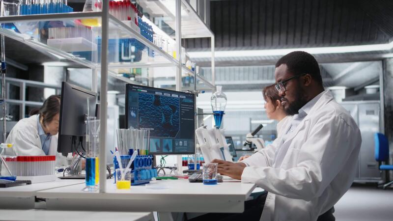 Histology technician using pipette to extract reagent from glassware into test tube at laboratory bench. Research facility worker at PC desk does pipetting procedure with dropper, camera A Pro Video