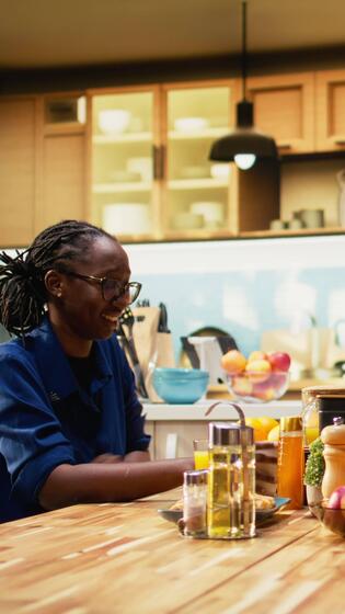 Vertical Smiling black man working remotely at the table and chatting with girlfriend, drinking coffee while the boyfriend writes a report on his computer. Teleworking at the breakfast table. Camera A. Pro Video