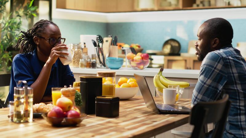 Smiling black man working remotely at the table and chatting with girlfriend, drinking coffee while the boyfriend writes a report on his computer. Teleworking at the breakfast table. Camera B. Pro Video