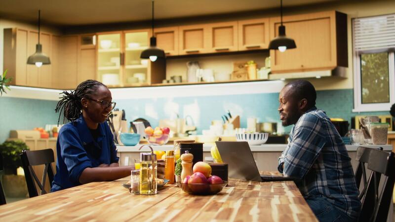 Smiling black man working remotely at the table and chatting with girlfriend, drinking coffee while the boyfriend writes a report on his computer. Teleworking at the breakfast table. Camera A. Pro Video