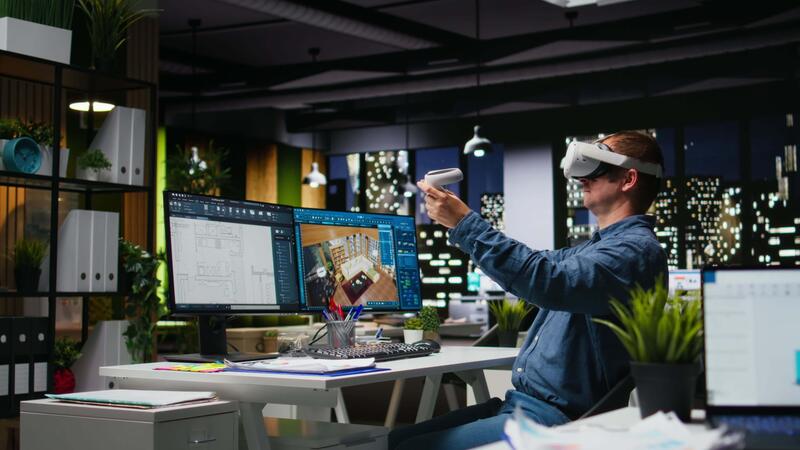 Interior designer using virtual reality headset to create a floor plan, working on apartment layout with architectural software and blueprints. VR glasses and CAD modeling program. Camera A. Pro Video