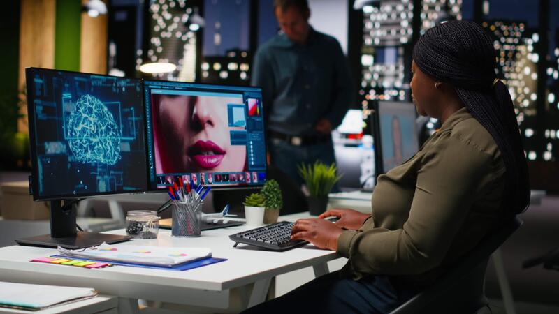 African american woman photographer uses neural networks system to edit photos, creating professional content with artificial intelligence. AI powered software for retouching on pc. Camera B. Pro Video