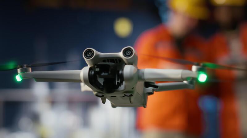 Engineers technicians using drone for remote operations and aerial mapping on offshore rig, improving logistics, planning and modern maintenance through advanced technology. Camera B. Pro Video
