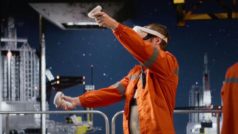 Offshore expert in VR headset simulating extraction and maintenance tasks, using futuristic technology to improve safety, efficiency and performance in the oil and gas industry. Camera B. Pro Video