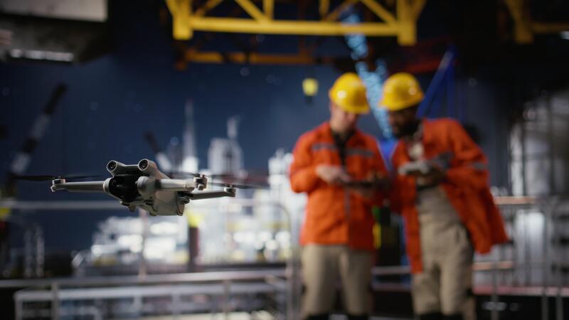 Engineers technicians using drone for remote operations and aerial mapping on offshore rig, improving logistics, planning and modern maintenance through advanced technology. Camera A. Pro Video