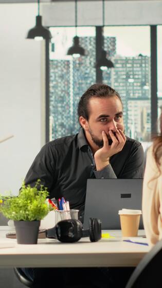 Vertical Diverse staff members in office working on forecasting insights. Professional employees review visual data and diagrams to enhance effective management and business goals. Camera B. Pro Video