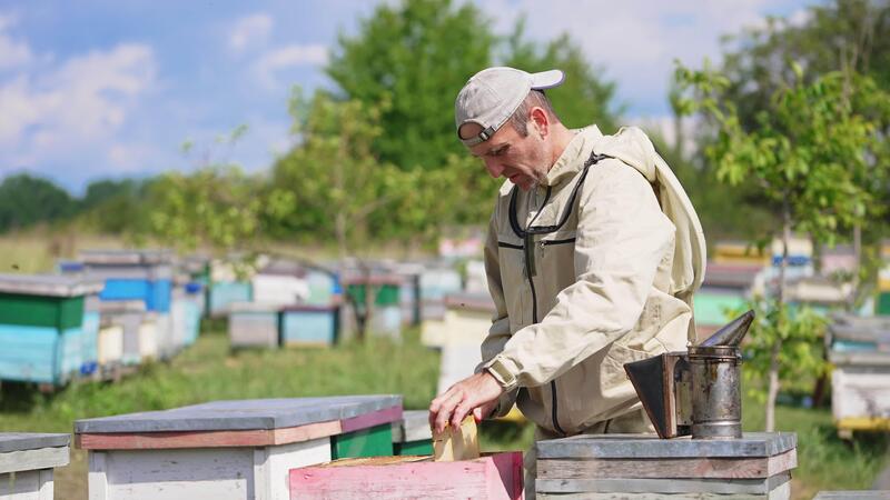Adult male apiarist pulls an empty half-frame out of a hive. Man smiles satisfactory and takes another frame with bees to place it in the hive. Pro Video