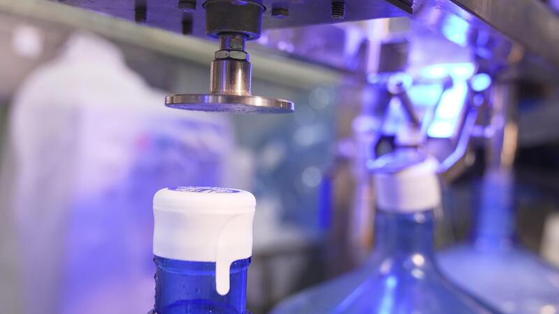 Automatic machine putting and stamping the cork at the flask. Bottles are filled with water at backdrop in blur. Pro Video