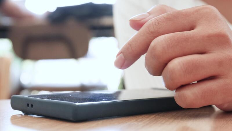 Hand using smartphone, Close-up of a person hand interacting with a smartphone on a wooden table, showing touch gestures and a calm indoor atmosphere Pro Video