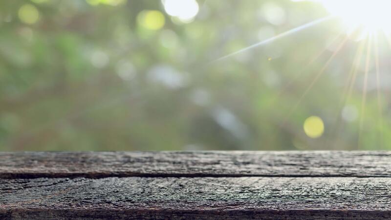 Old wooden table with soft sunlight and natural bokeh background. Perfect as a backdrop for product display, presentations, or relaxing nature themes Pro Video