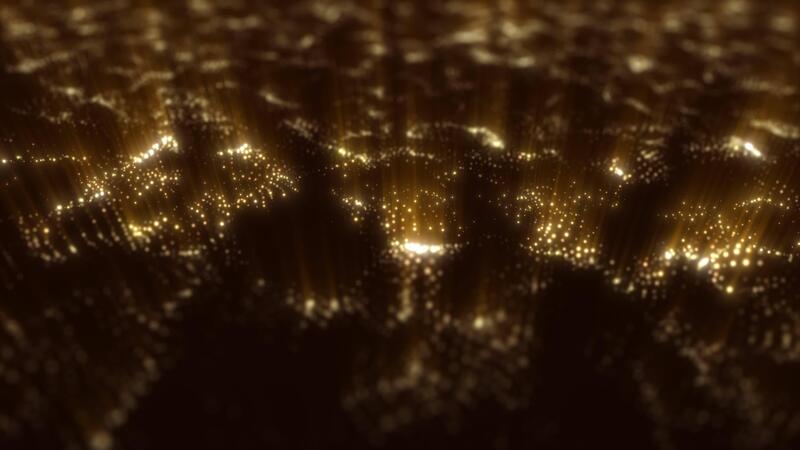 Glowing golden particle waves flowing in soft motion. Abstract shimmering surface with dynamic light depth and digital spark textures. Elegant luxury background. 4K 60fps loop. Pro Video