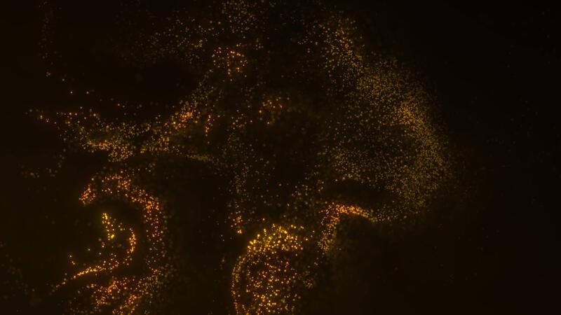 Flowing golden particles forming liquid sparkling shapes with soft glowing dust transitions and elegant abstract motion. Pro Video