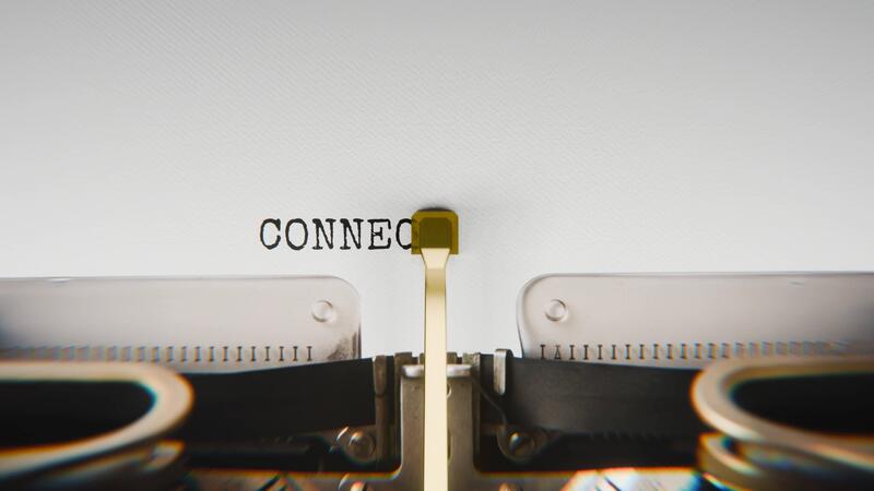 Old mechanical typewriter typing Connection Established in a close up view, with metal letters striking the white paper. Pro Video