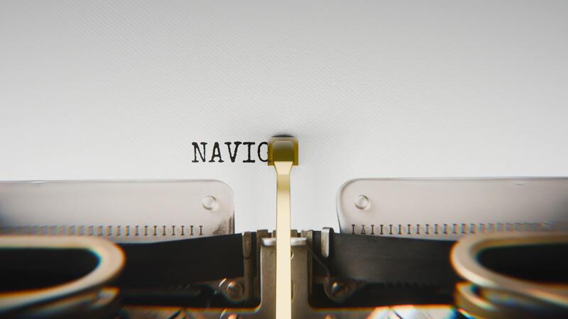 Old mechanical typewriter typing Navigation in a close up view, with metal letters striking the white paper. Pro Video
