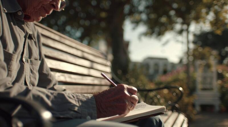 Elderly man sitting on a park bench, enjoying a sunny day while sketching in a notebook, capturing the serene atmosphere Free Video