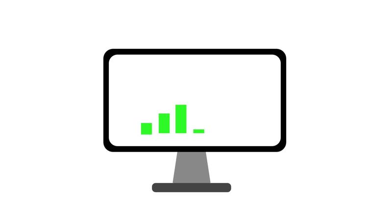 Computer monitor icon animation displaying a green rising bar chart followed by a red declining bar graph on a white background Pro Video