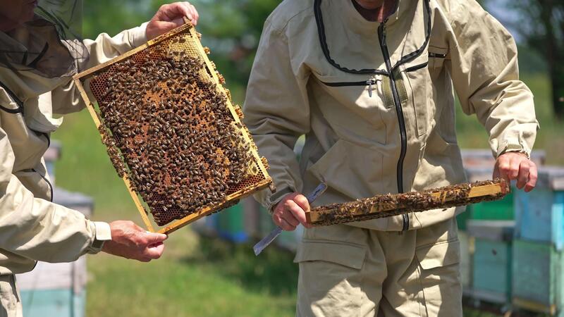Two apiculturists holding honey frames with sealed cells and lots of bees on. Beekeepers turning frames in hands checking them up. Blurred backdrop. Pro Video