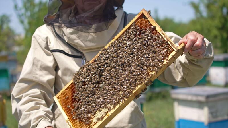 Honey frame covered with bees with a hole in the middle. Beekeeper turning frame in hands showing it to the camera. Close up. Pro Video