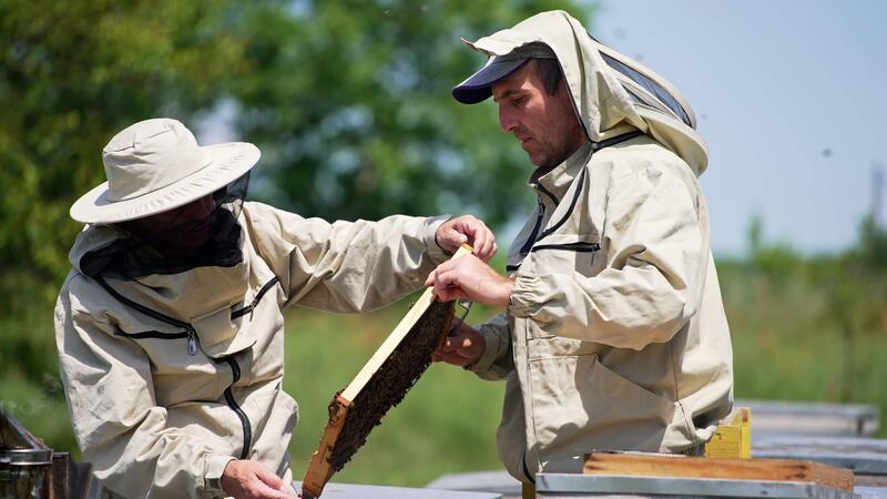 Male apiarists holding a frame covered with working bees. Men discussing something pointing at the wax cells. Blurred backdrop. Pro Video