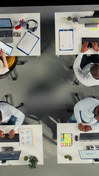 Vertical Top down view zoom in of diverse colleagues working in modern office, focusing on project planning, performance metrics and report sharing. Business people review data for forecasting. Camera A. Pro Video
