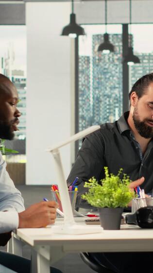 Vertical Professional people analyzing documents and graphs for risk assessment. Diverse work team collaborating on report writing and forecasting in office, executive management. Camera B. Pro Video